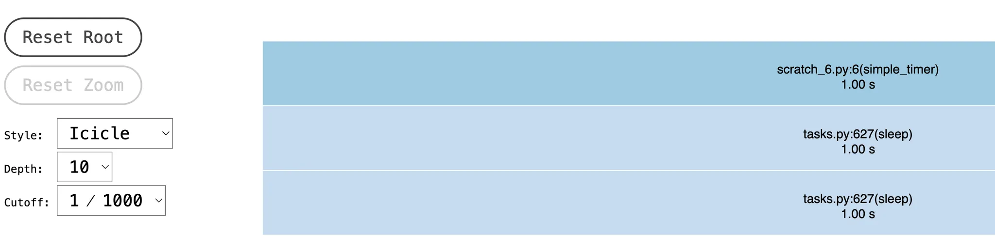 진행 결과입니다. `..atches/scratch_6.py:6 simple_timer` 에서 simple_timer 의 동작시간 잡아냄을 확인 할 수 있습니다.